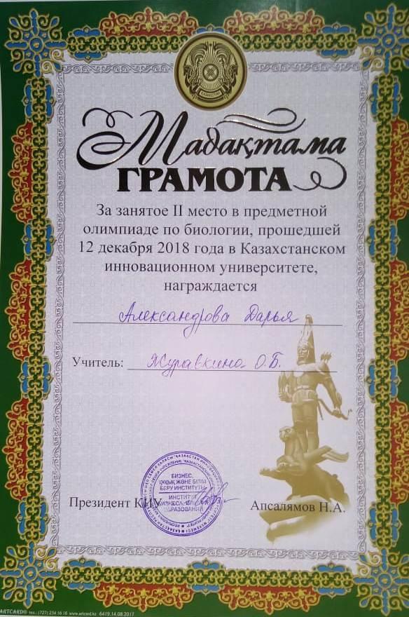 12.12.18 жылы Қазақстан инновациялық Университетінде биология пəнінен өткен олимпиада бойынша оқушымыз Александрова Дарьяны 2 орын иеленуімен және жетекшісі Журавкина О.Б. ҚҰТТЫҚТАЙМЫЗ!!!