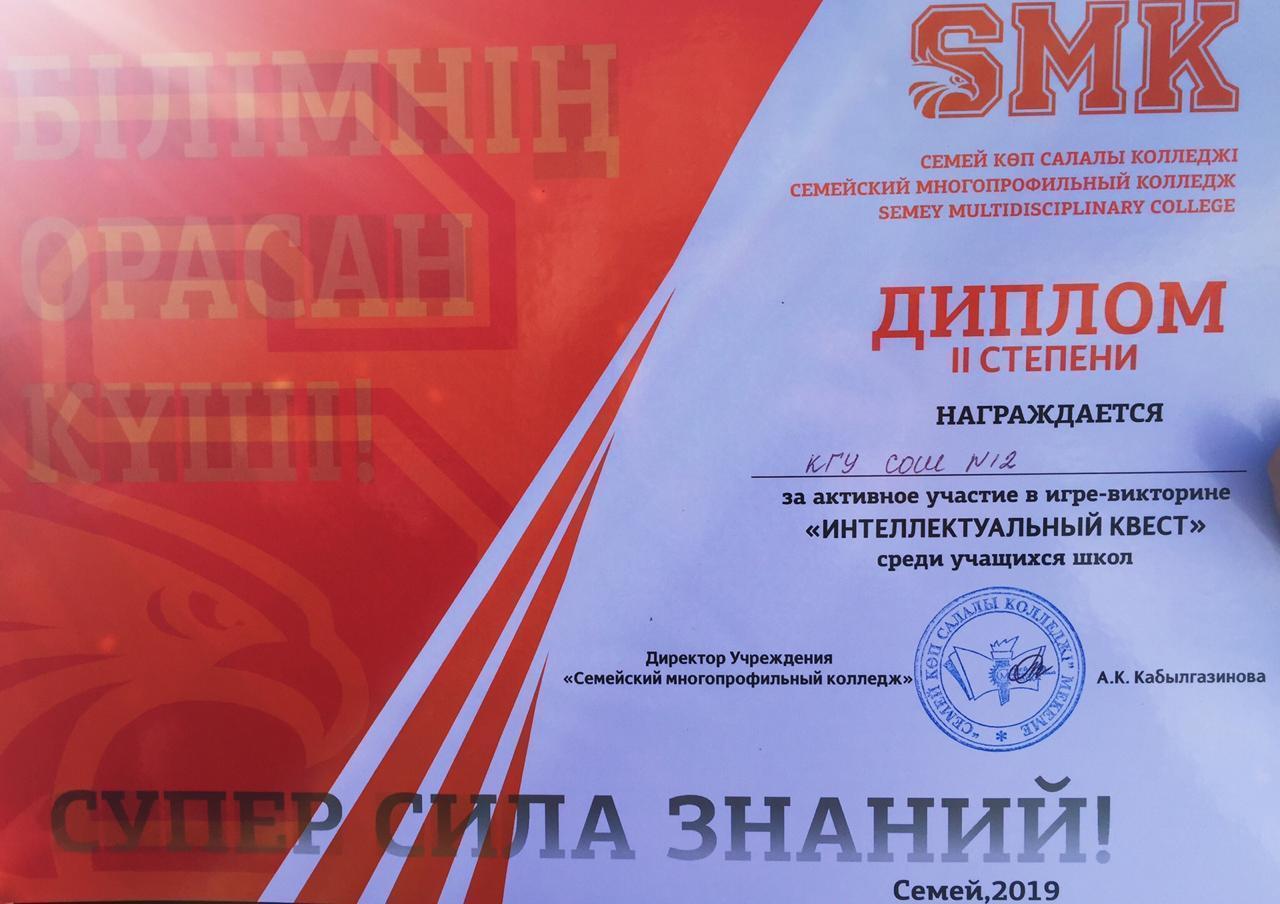 24 январь 2019 0 1 2 3 4 5 Поздравляем с победой! "Интеллектуалдық квест" викториналық ойынның қатысушыларын 2 орын алуымен құттықтаймыз! Ойынға қатысқандар: Байжанова М. Рахимжанова А. Яковлев А. Шарипова М. Туксумбаева Д.